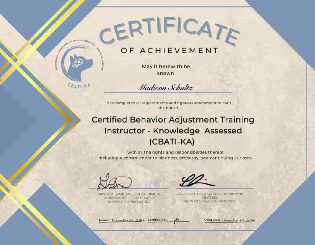 My journey with dogs began in college when I became a foster for a Service Dog organization. I quickly fell in love with working with dogs. I eventually went on to professionally train at the same organization. During my time there I fostered nineteen dogs and welcomed two hopeful breeders into my home. I placed over twenty dogs with children and veterans. Dog training is my passion and I hope to work with you and your dog!